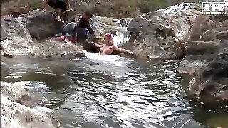 светловолосая жгучая шлюха атаковала длинный член чумазого мужика прямо на каменном берегу реки